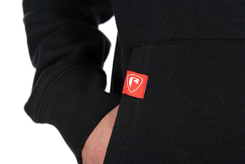 Sweatshirt mit gebrandeter Mütze Fox Rage in Farbe schwarz mit Logo weißspeziell für Schwarzbarsch und Raubfischangeln.