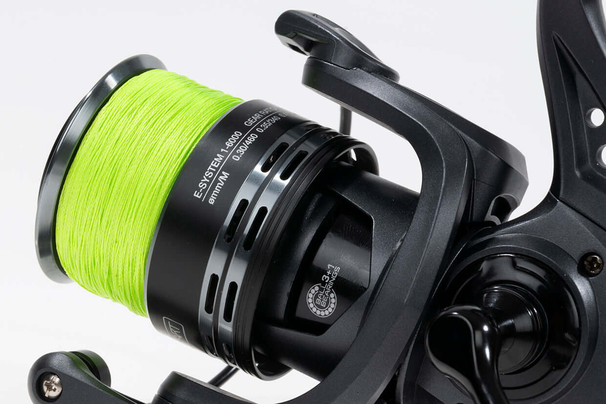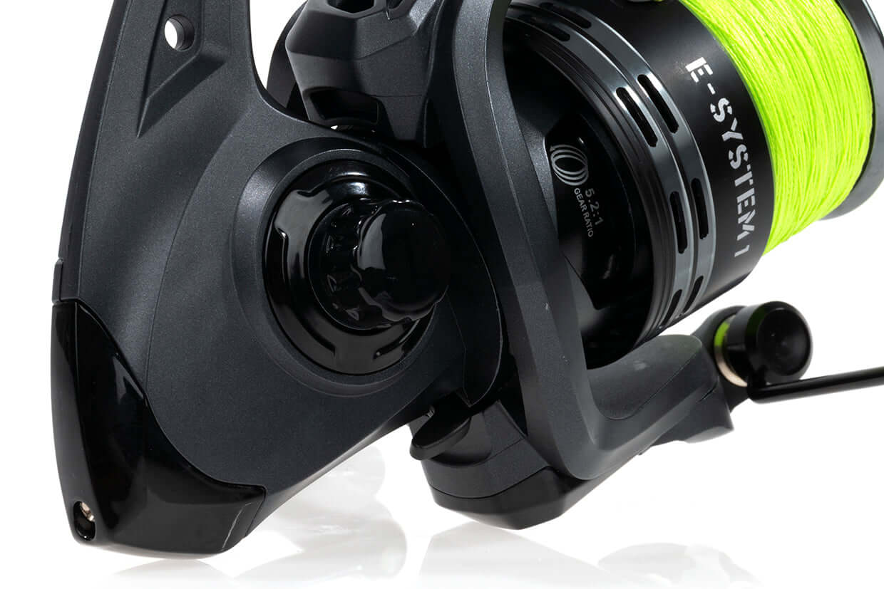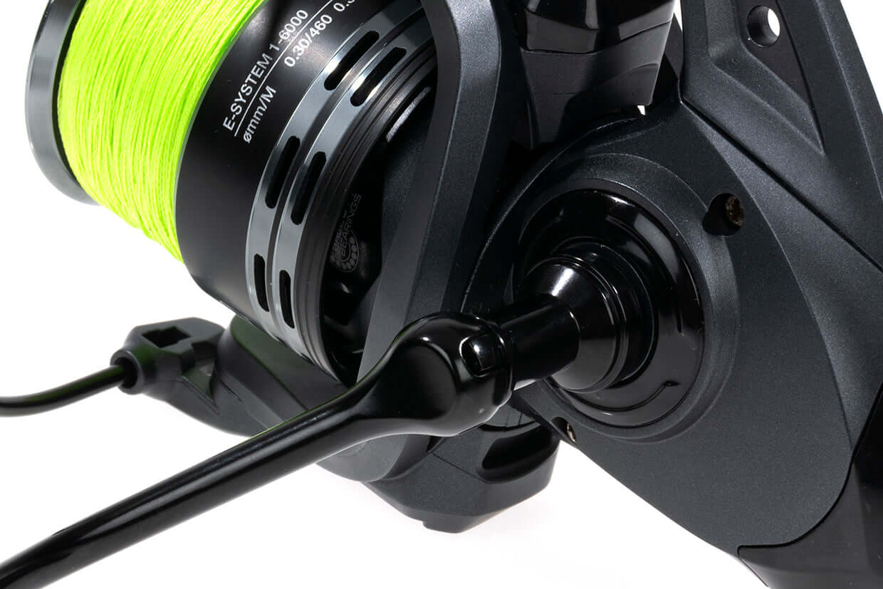 Rolle von spinning der Marke Hart, Modell E-System 1, in Farbe schwarz, speziell für das Schwarzbarsch- und Raubfischangeln.