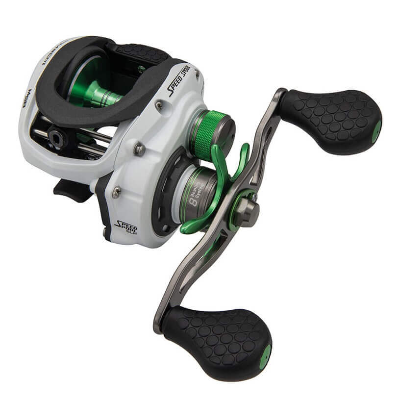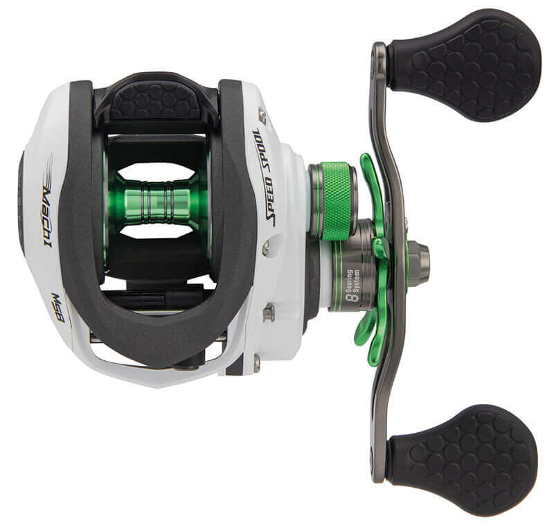 Rolle von Casting der Marke Lews Modell Mach 1 SLP in Farbe weiß und grün, speziell für Barsch- und Raubfischangeln.