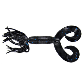 Gummifisch von 127 Millimetern der Marke Yamamoto Modell Double Tail Hula Grub Farbe schwarz mit Flecken blau, speziell für das Schwarzbarsch- und Raubfischangeln. Er zeichnet sich durch seine doppelte Schwanzbewegung und Fransen aus, die sich ideal für verschiedene Arten der Montage eignen. Aufgrund seiner einzigartigen Form, diese Gummifisch bleibt er auf dem Grund und sorgt für viel Aktion.