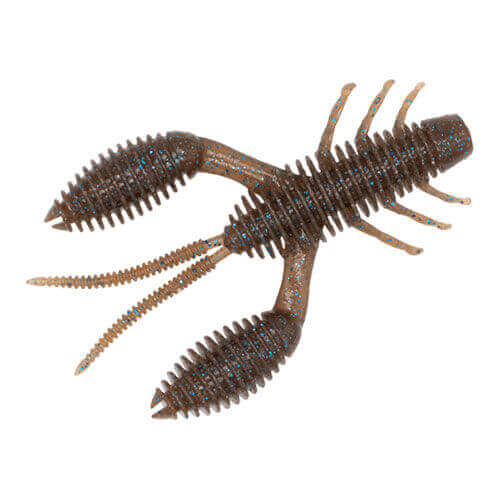 Gummifisch in Form einer Krabbe von 90 Millimetern der Marke Geecrack Modell Blasebalg Kraulen in Farbe braun mit mit blauen Sprenkeln, speziell für die Schwarzbarschfischerei.