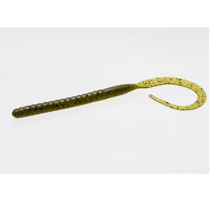 Gummifisch wurmförmig mit schlankem Körper und großem Ringelschwanz von 260 Millimetern der Marke Zoom Modell Ol' Monster Farbe grün mit schwarzen Streifen. Es ist mit Salz imprägniert.