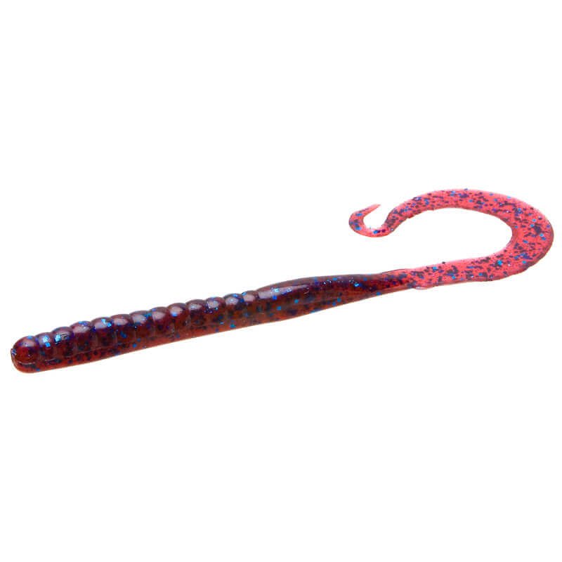 Gummifisch wurmförmig von 225 Millimetern der Marke Zoom Mag 11 Farbe rot mit mit blauen Flecken. Es ist ein großer Wurm mit einem festen Körper und einem gewellten Schwanz. Er ist mit Salz imprägniert.